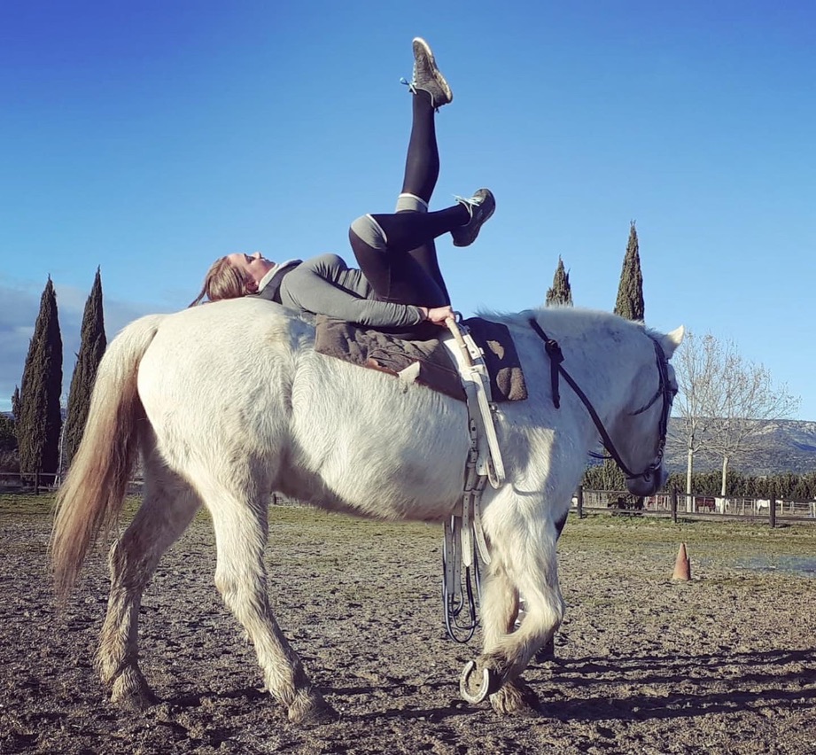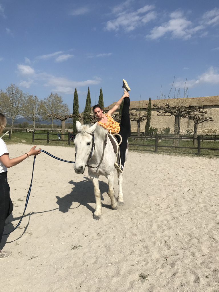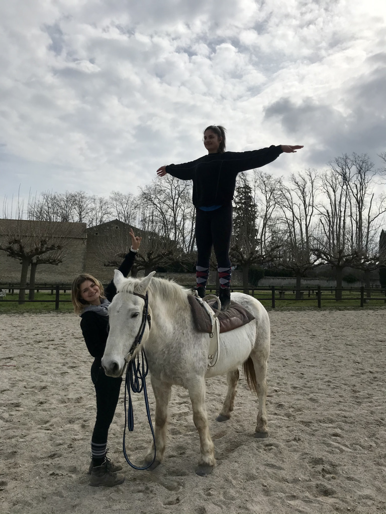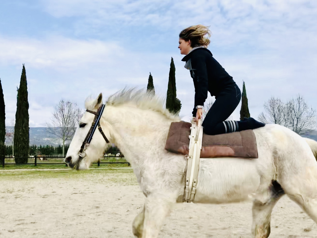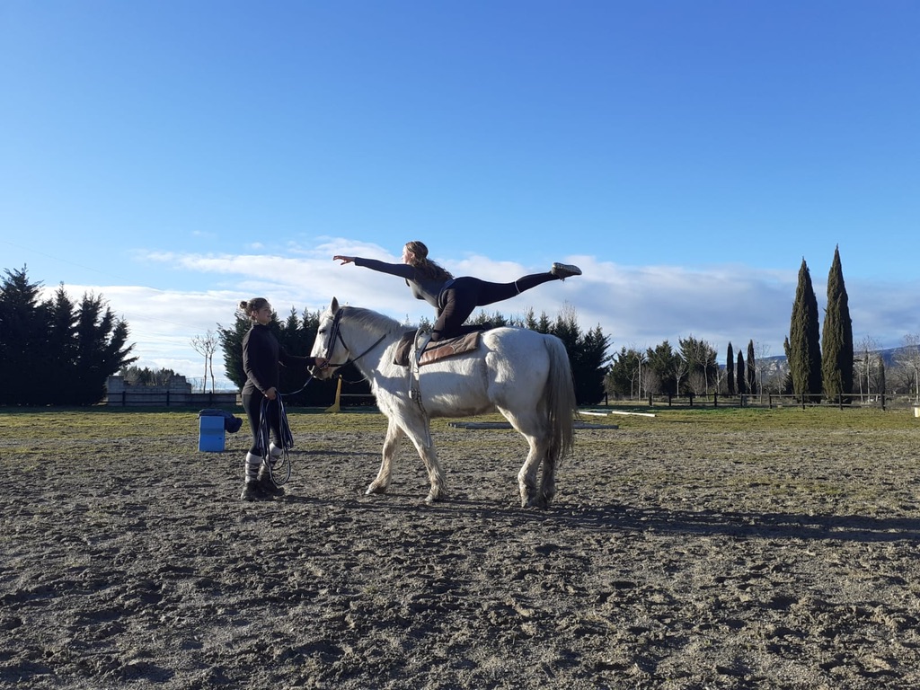 La voltige en cercle est un sport équestre consistant à effectuer, individuellement ou en équipe, des figures acrobatiques et esthétiques sur un cheval longé au pas ou au galop sur un cercle. Excellente en complément d’autres activités équestres, la voltige permet de travailler d’une autre manière assiette et équilibre.